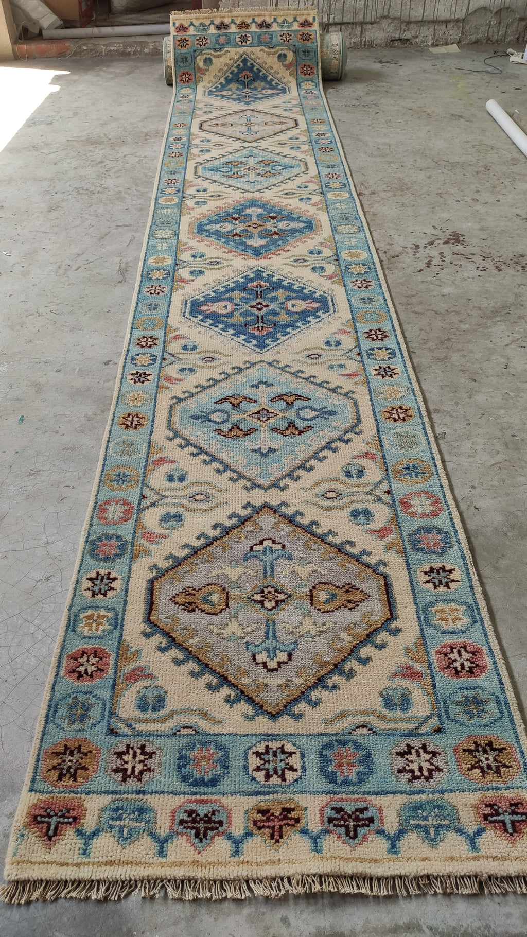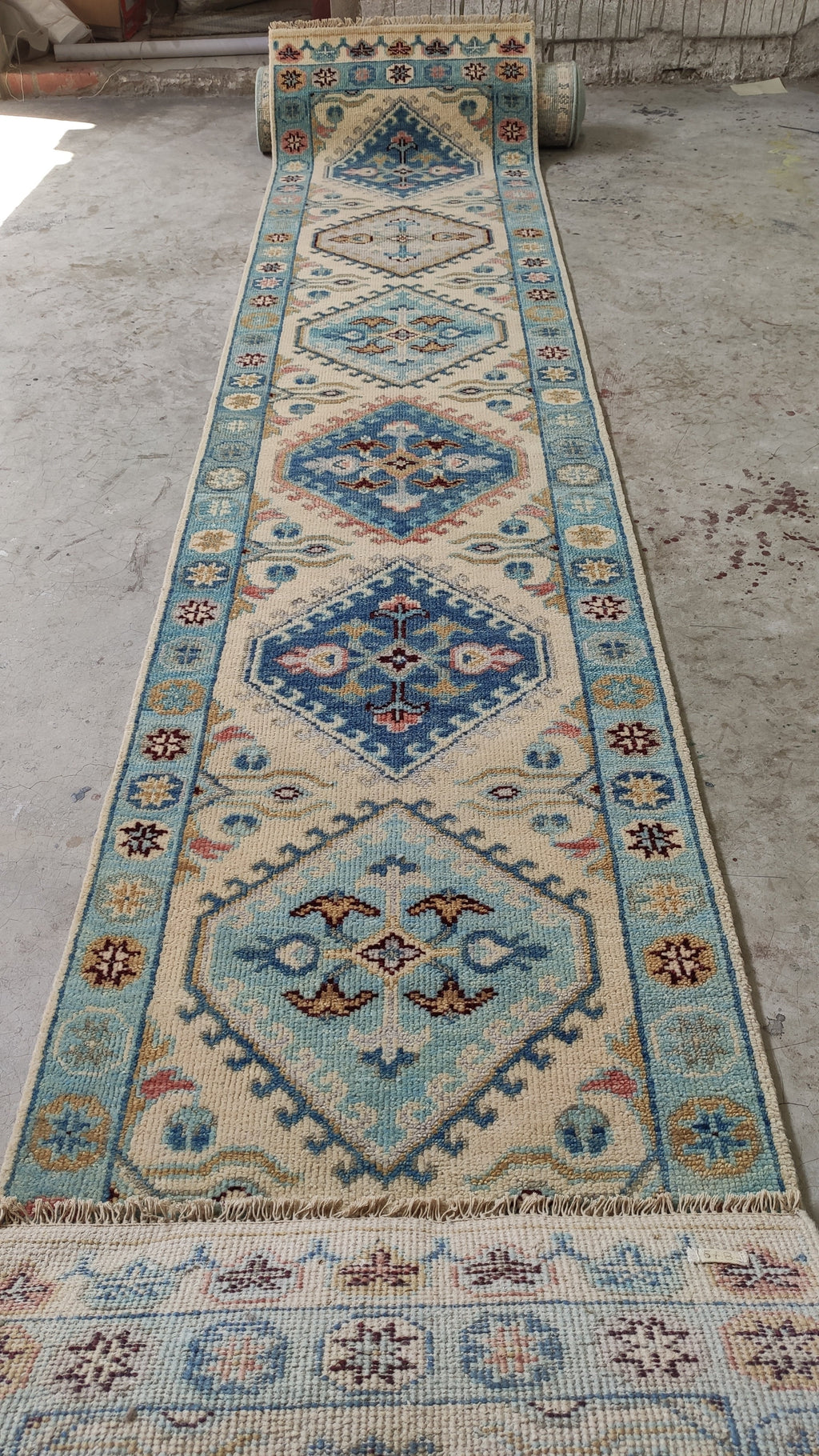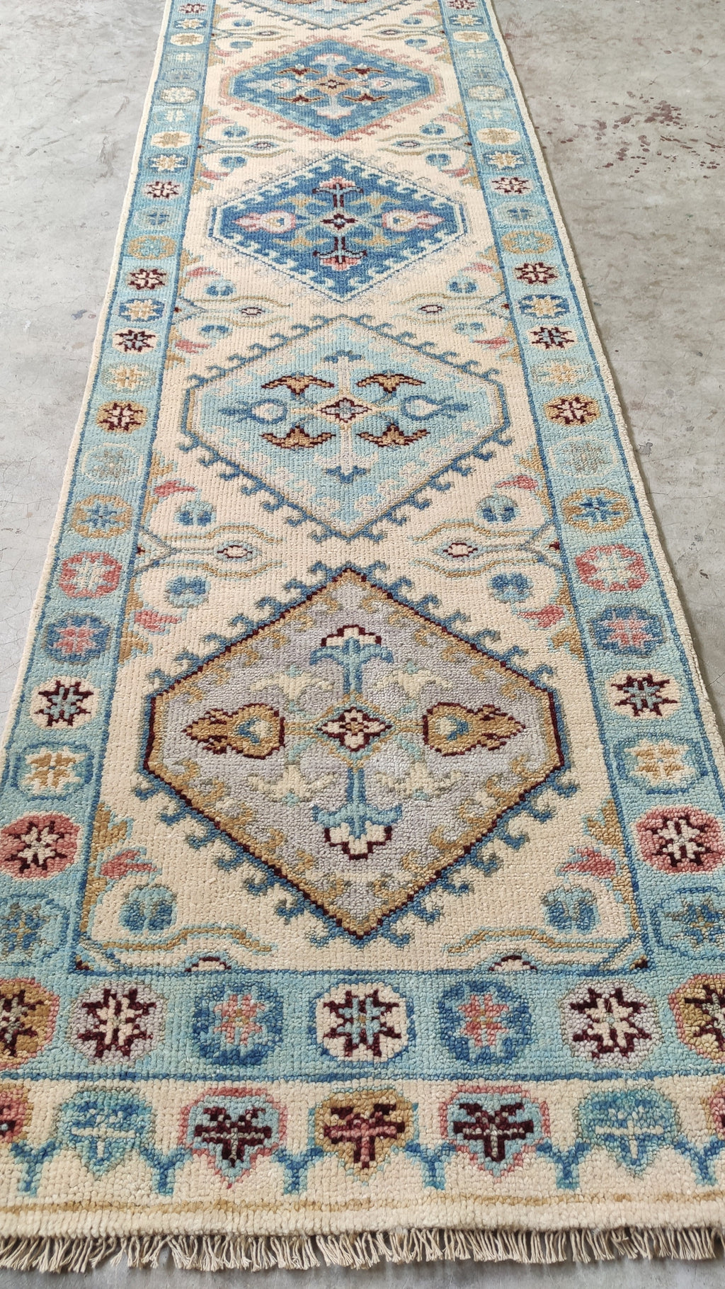 Mia 2.6x13.9 Ivory and Light Blue Hand-Knotted Oushak Runner Rug
